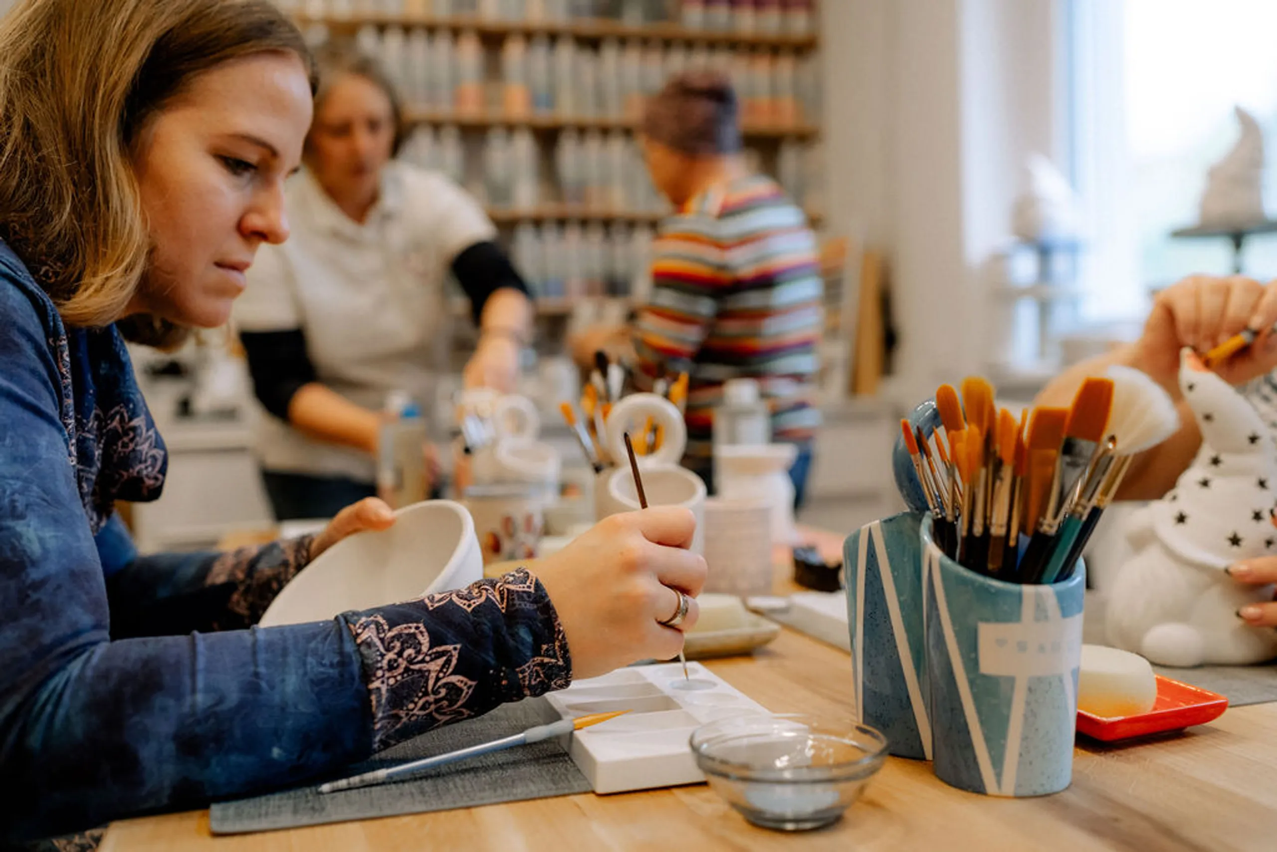 Bei mir bist du herzlich willkommen, Fortgeschrittene:r, Wiedereinsteiger:in oder Anfänger:in. Mir ist wichtig, dass du eine tolle Zeit in meinem Atelier verbringst, dich wohl fühlst und einzigartige Stücke kreierst, selbst wenn Farben & Pinsel (noch) nicht unbedingt zu deinen Stärken zählen.